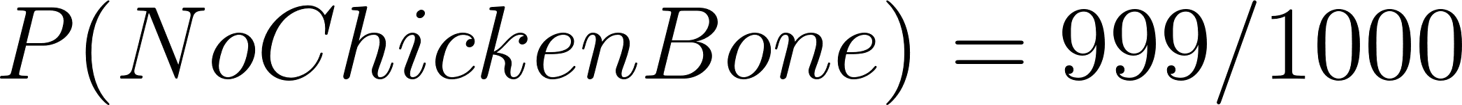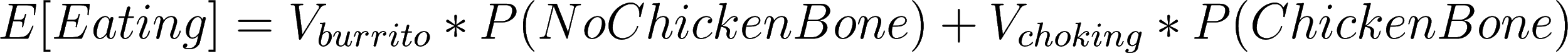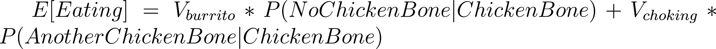 Now, in order to find the expected value of continuing eating, I need to also know the probability of finding a bone in my burrito. I believe in my life, I’ve had about exactly 3847 burritos. This is the first time I’ve ever noticed a chicken bone in my burrito. I think it’s also fair to assume that on more than one occasion, I may have simply not noticed the chicken bone in my burrito.